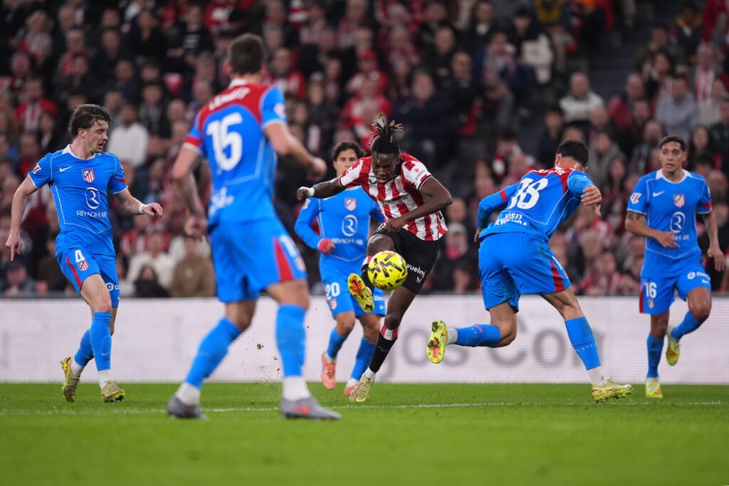 Simeone colocó un once inicial poco habitual tras las bajas de Baena, Giménez y Cardoso, lesionados en el Camp Nou. La línea defensiva la formaron Molina, Pubill, Lenglet y Hancko. En el centro del campo Gallagher acompañó a Barrios y Almada a Julián en la punta de ataque. Desde el comienzo se vio a un Athletic dominador y con ese plus de competitividad que tiene el equipo de Valverde en los duelos contra el Atlético.