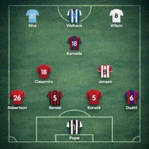 - Nick Pope; Robertson, Senesi, Konaté, Guéhi; Casemiro, Kamada, Jensen; Bernardo Silva, Welbeck, Harry Wilson
