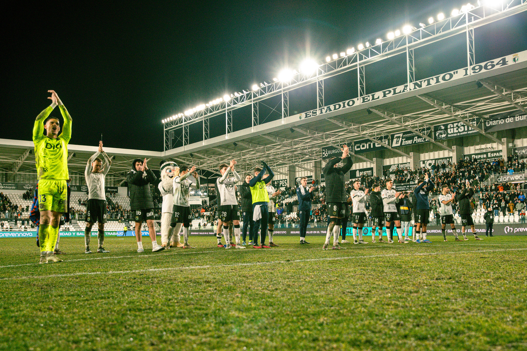 Los jugadores del Burgos celebrando la victoria ante el Huesca con su afición. Fuente Burgos CF
