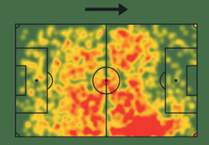 Con balón ya le conocemos todos. Un futbolista con un punto de gravedad muy bajo, que le gusta tener el balón pegadito al pie y al que es difícil arrebatarle la posesión. Tiene una gran capacidad de pase en todos los rangos y su polivalencia le permite ser la pieza más movil del once, dejándose ver por todas las zonas del campo. Tiene, eso sí, una evidente prioridad de caer por derecha, como bien se puede ver en el siguiente mapa de calor
