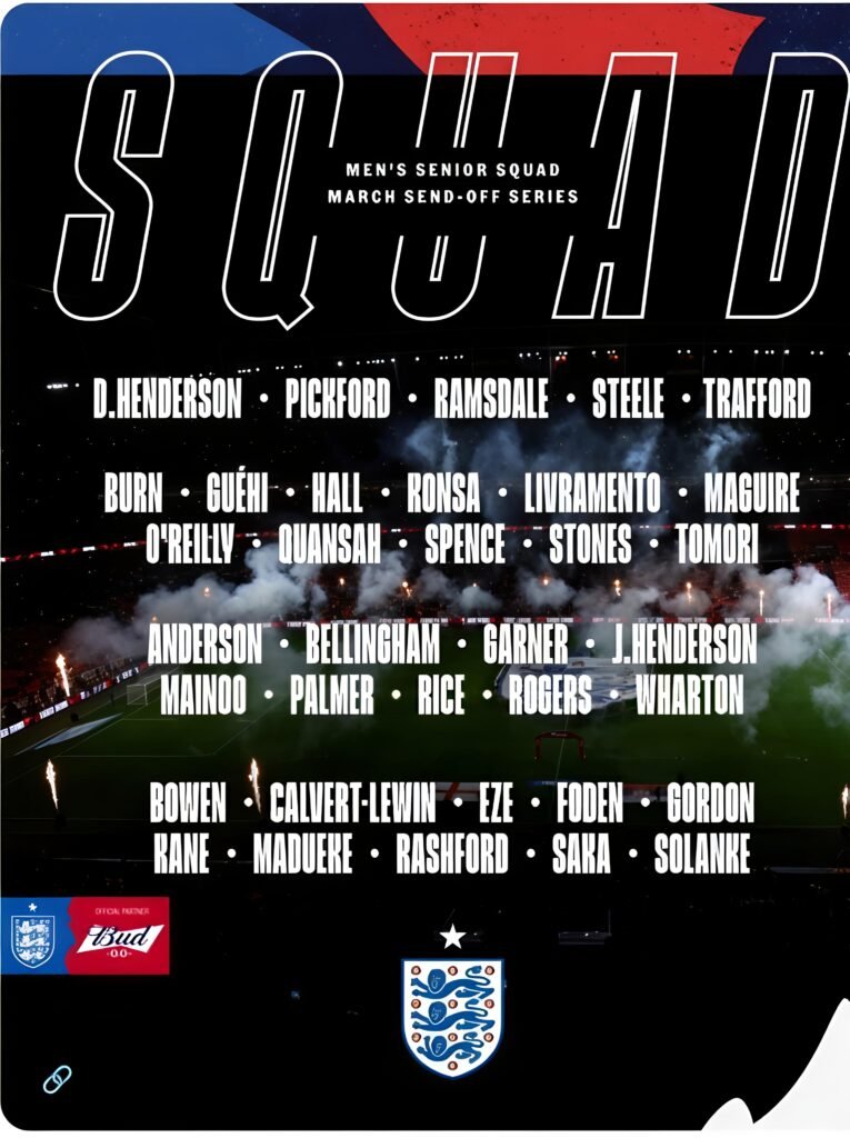 Delanteros: Harry Kane, Bukayo Saka, Phil Foden, Cole Palmer, Marcus Rashford, Dominic Calvert-Lewin, Dominic Solanke, Anthony Gordon, Eberechi Eze, Jarrod Bowen, Noni Madueke