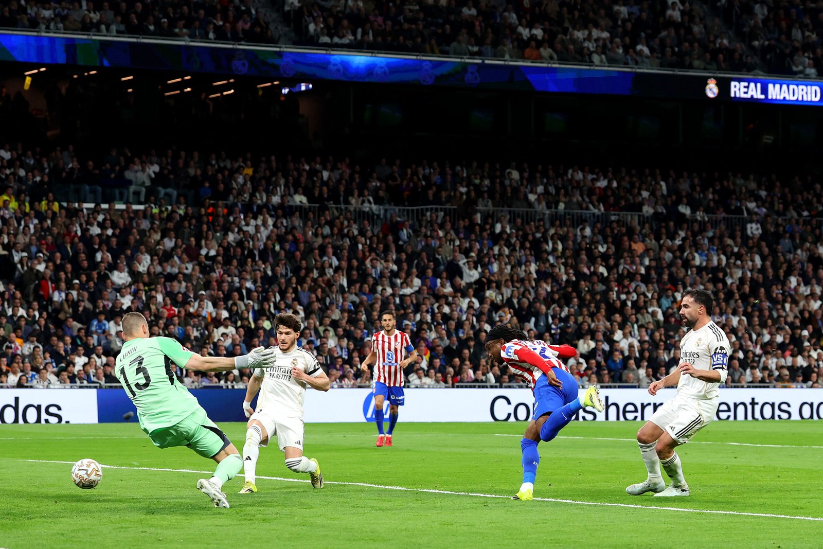 A partir de la mitad del primer tiempo, el Real Madrid empieza a tener un mayor dominio de balón; sin embargo, no consiguió marcar un gol al equipo de Simeone. En el minuto 23, un córner perfectamente ejecutado de Güler dio lugar a un remate de Rüdiger que terminó sacando Giuliano Simeone en la línea hasta en dos ocasiones. Debido al dominio blanco, los rojiblancos trataron de frenar a los jugadores locales con algunas faltas que posteriormente se tradujeron en tarjetas amarillas: la primera la recibió Cardoso en el 26 y la segunda Ruggeri en el 35. Antes de la acción del italiano, en el minuto 32, los colchoneros sorprendieron en un contragolpe a la defensa del Real Madrid y, tras una combinación por la banda entre Lookman y Ruggeri, el lateral italiano centró el balón dentro del área y Giuliano Simeone realizó un taconazo perfecto para que Lookman batiera a Lunin y pusiera el 0-1 en el marcador.