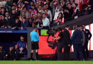 Clément Turpin revisando la expulsión de Eric García en el VAR. Vía: Angel Martinez/Getty Images.