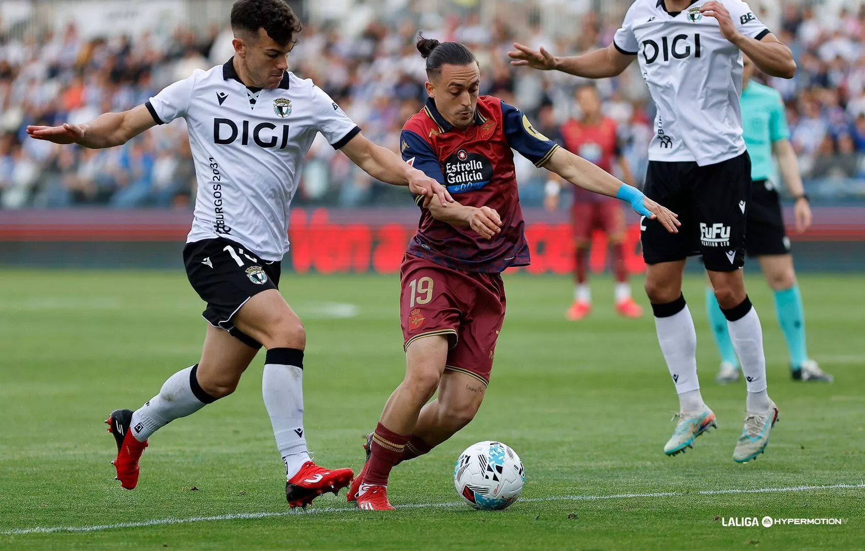 El Burgos siguió dominado, pero empezó a hacerlo con un par de revoluciones de más y por tanto no les salían tanto las cosas. Pero en el minuto 38, Quagliata en su intento de ir a por el balón le propinó un codazo a Sergio González en el área. No se señaló nada en principio, pero Luis Mario Milla llamó a Adrián Fuentes para que revisara la acción en el VAR. Tras ser revisada la acción, Adrián Fuentes señaló penalti favorable al Burgos. Curro tomó la responsabilidad y no la desaprovechó e hizo el gol del empate. El Burgos y la grada se crecieron y aumentaron la intensidad hasta casi el máximo. El Dépor volvió a contemporizar el balón para rebajar el ritmo del Burgos en el descuento. En el quinto minuto de prolongación Yeremay le propinó un codazo en la nuez a Atienza. Pero Adrián Fuentes, no solo no señaló falta, sino que le sacó amarilla a Atienza.